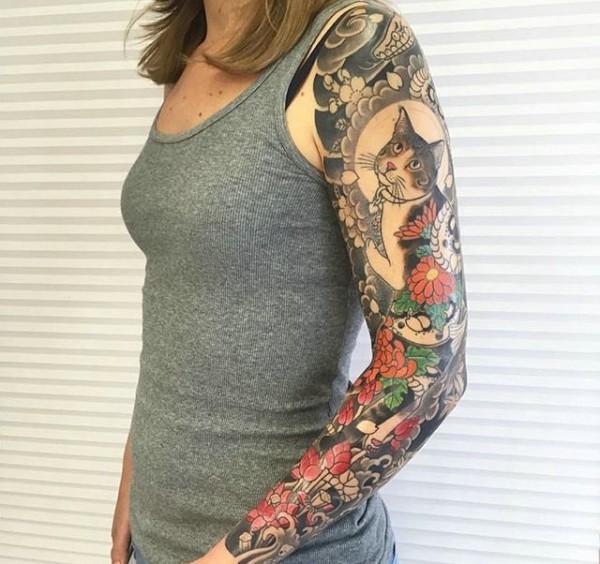 花臂日式花猫纹身图案很抢眼
