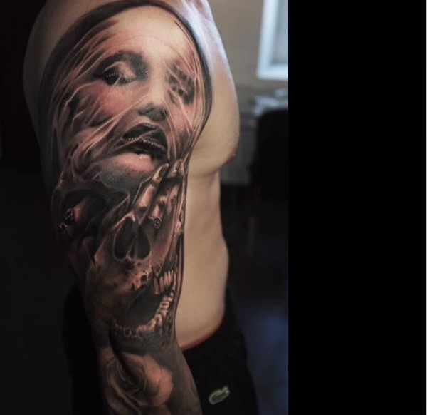 男人大臂黑白彼岸花骷髅_黑白纹身图案大全_纹身图吧