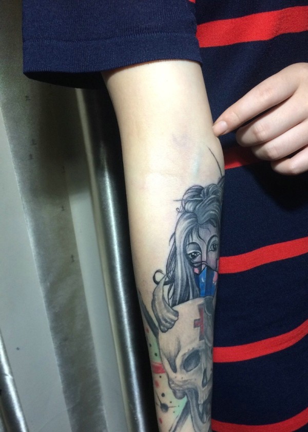 骷髅与美女一起的手臂纹身图案