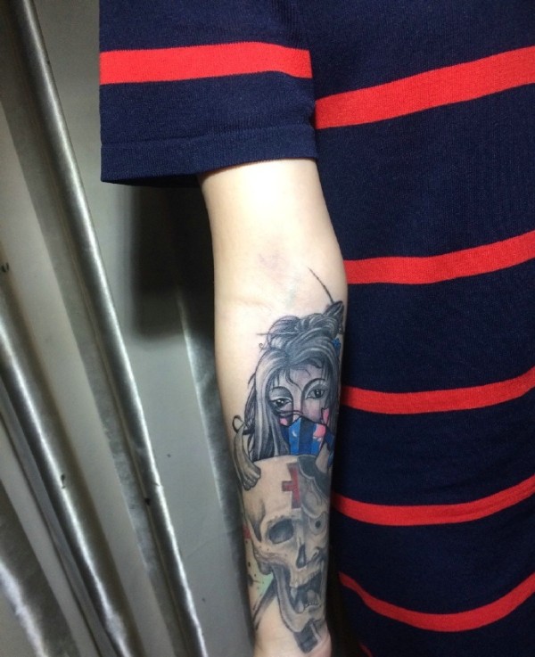 骷髅与美女一起的手臂纹身图案