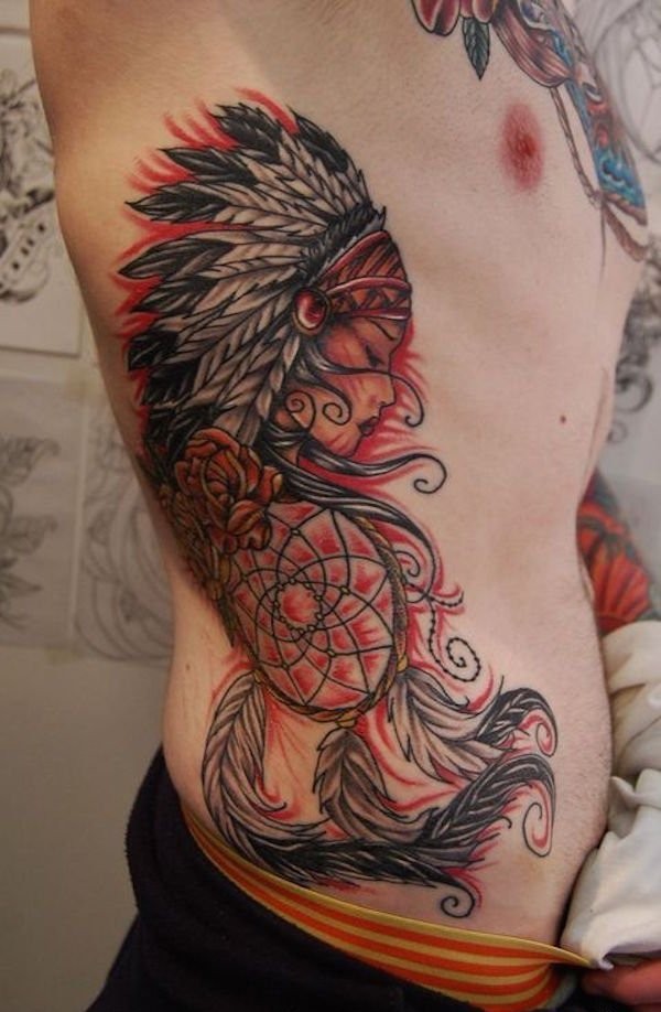 男子侧肋上漂亮的部落女子捕梦网纹身图案