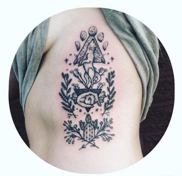 女生后腰纹身黑白灰风格抽象线条纹身图案