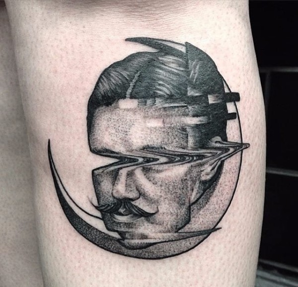 大臂上水波纹折射弯曲人物和铁路隧道纹身图案