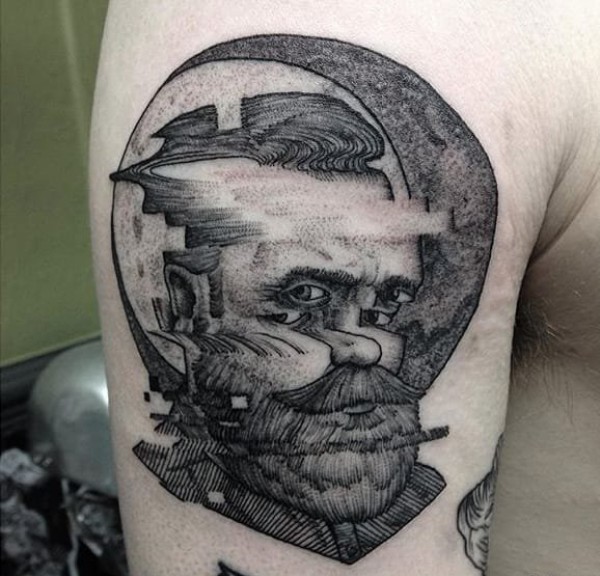 大臂上水波纹折射弯曲人物和铁路隧道纹身图案