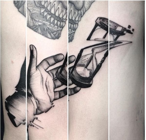 大臂上水波纹折射弯曲人物和铁路隧道纹身图案