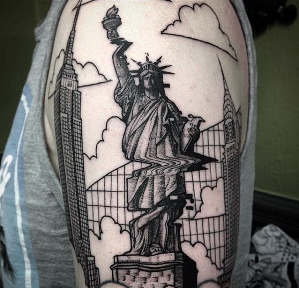 大臂上水波纹折射弯曲人物和铁路隧道纹身图案