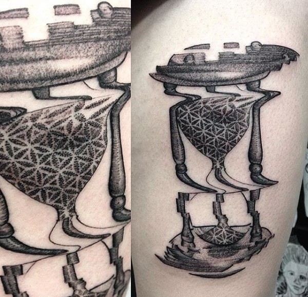 大臂上水波纹折射弯曲人物和铁路隧道纹身图案