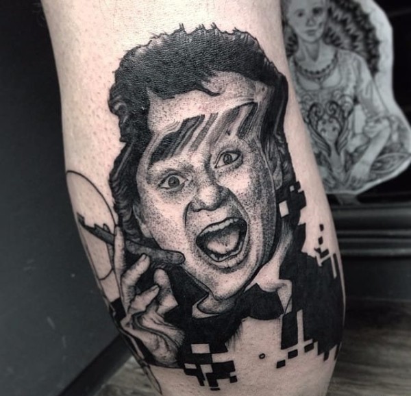 大臂上水波纹折射弯曲人物和铁路隧道纹身图案