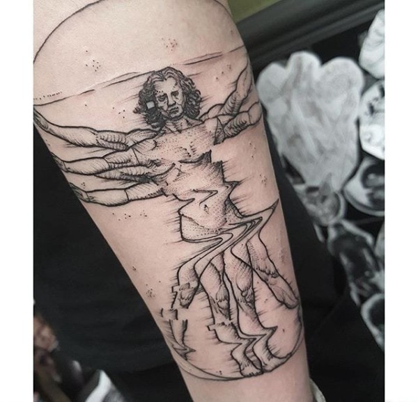 大臂上水波纹折射弯曲人物和铁路隧道纹身图案