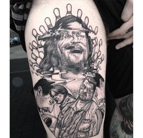 大臂上水波纹折射弯曲人物和铁路隧道纹身图案