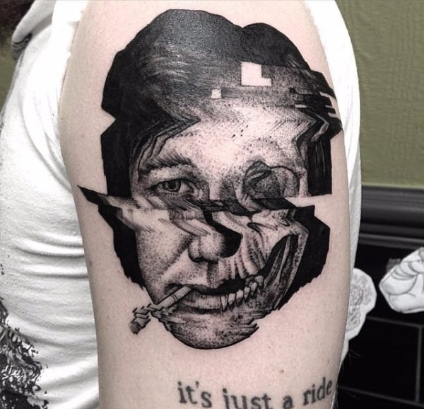 大臂上水波纹折射弯曲人物和铁路隧道纹身图案