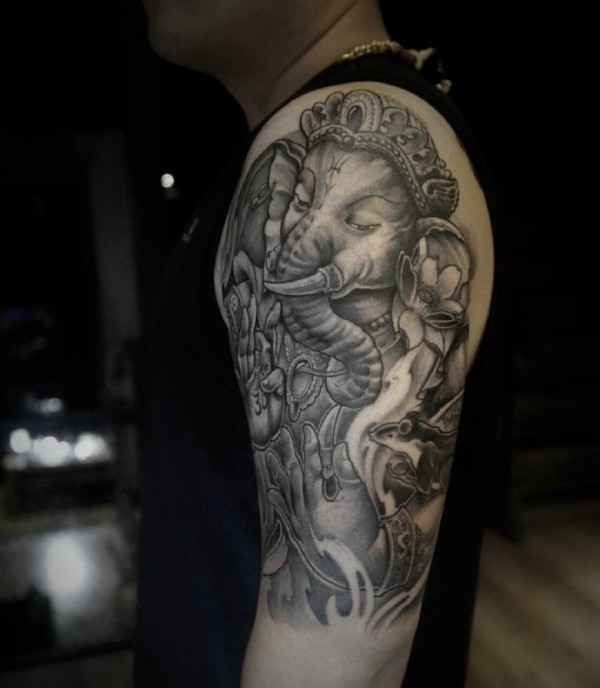 大臂新传统黑灰象神纹身图案