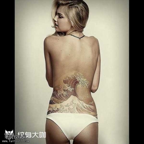 女生后腰纹身黑白灰风格抽象线条纹身图案