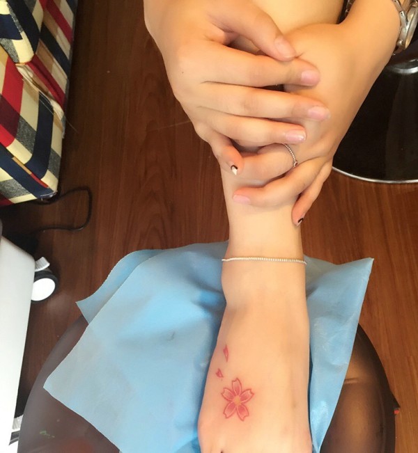 angelababy脚背彩色小花纹身图片