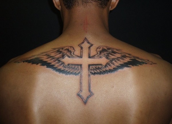 男士背上背着的大十字架纹身图片