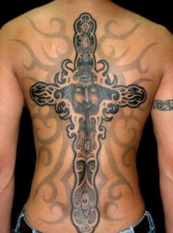 男士背上背着的大十字架纹身图片