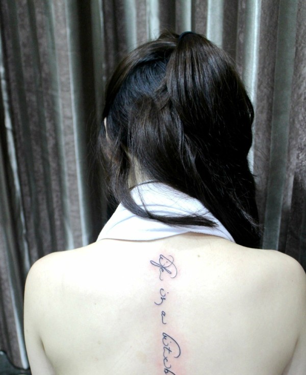 长发女生脊椎部的时尚英文纹身刺青
