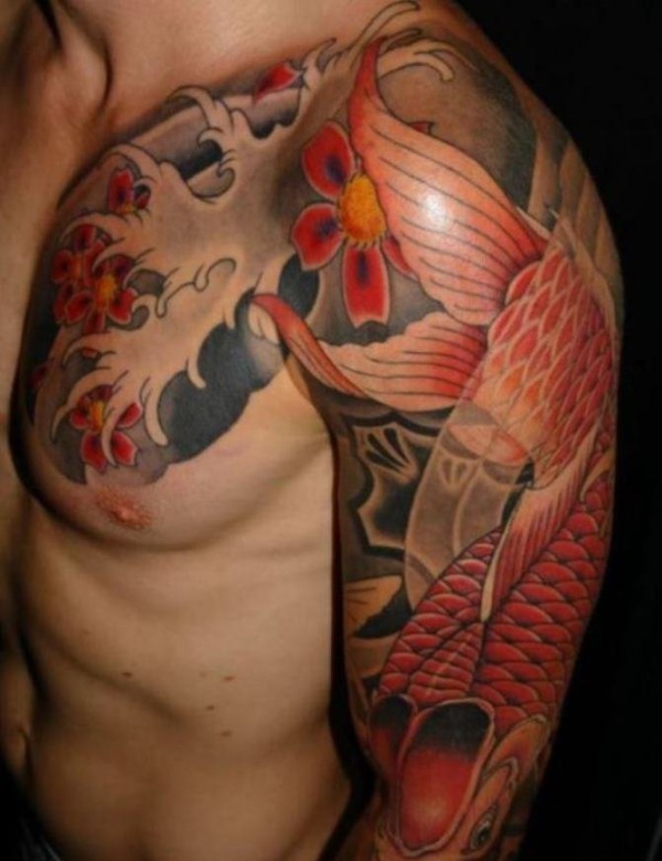 半甲莲花和鲤鱼图案纹身