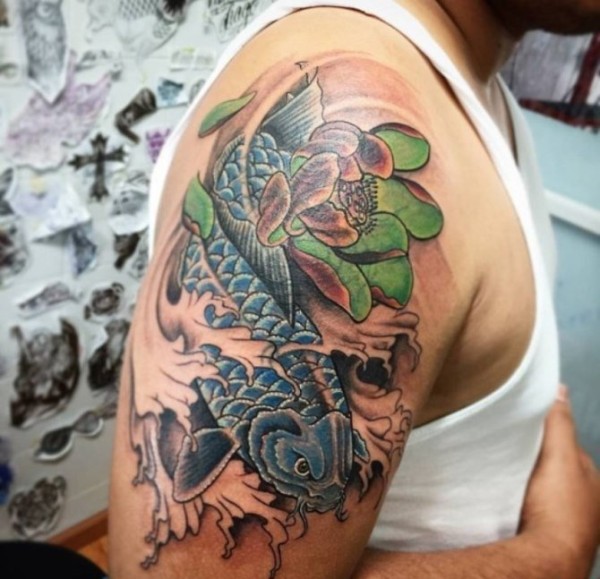 半甲莲花和鲤鱼图案纹身