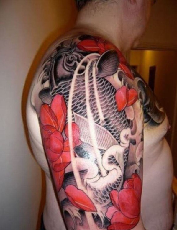 半甲莲花和鲤鱼图案纹身