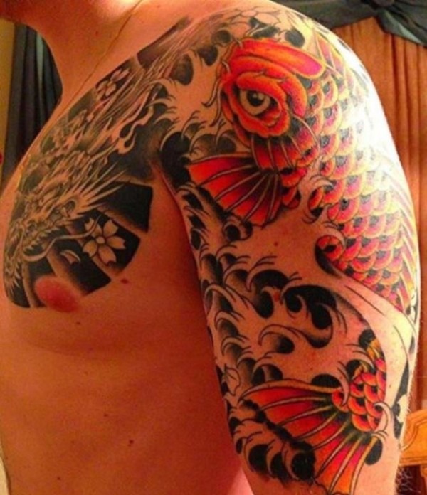 半甲莲花和鲤鱼图案纹身