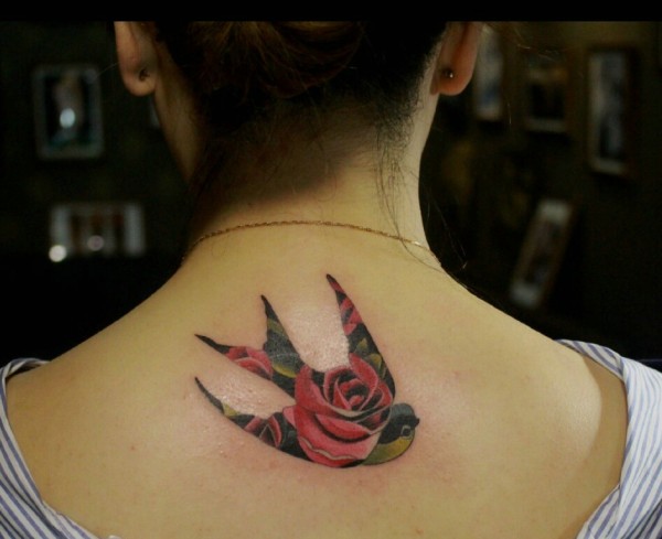 背着玫瑰的小燕子后背纹身刺青