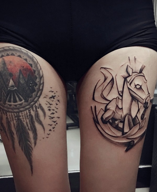 处在双大腿的不同图案纹身刺青