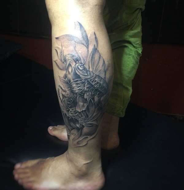 包小腿黑白小鲤鱼纹身图案有活力