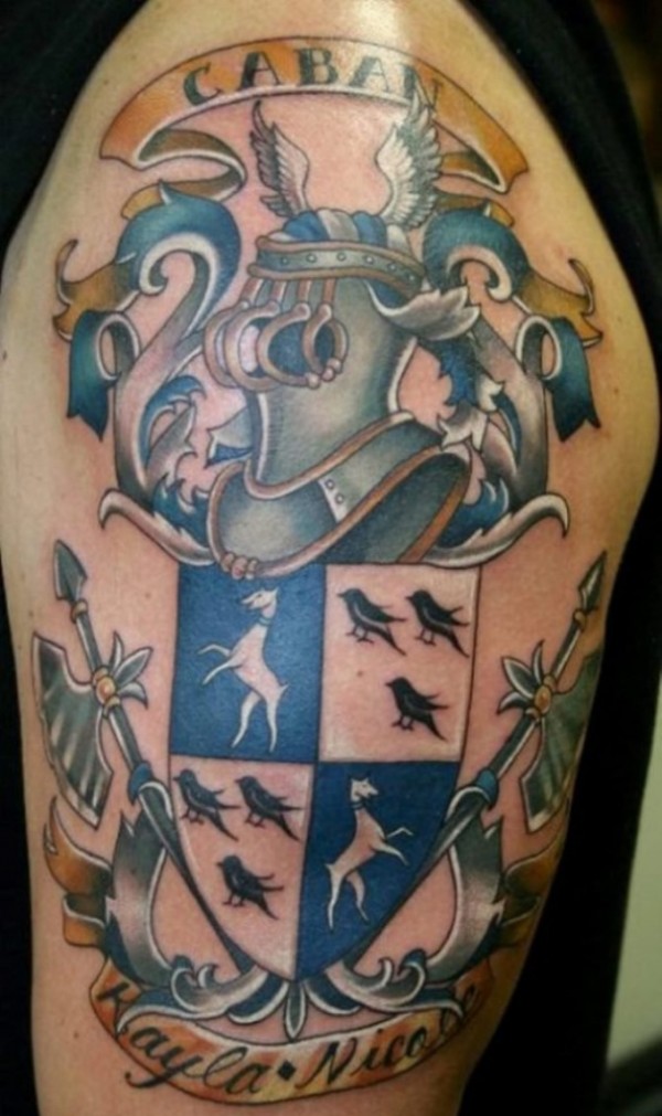 健壮男子左手大臂膀上超酷的盾形纹章纹身