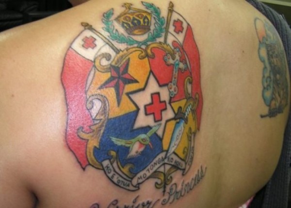 健壮男子左手大臂膀上超酷的盾形纹章纹身