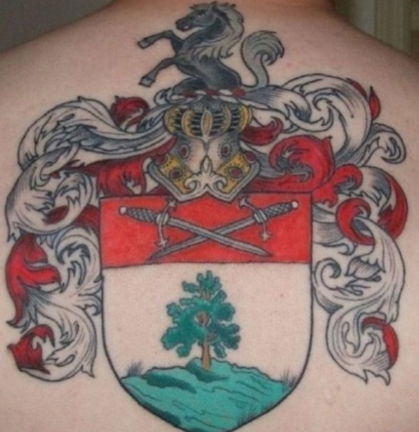 健壮男子左手大臂膀上超酷的盾形纹章纹身