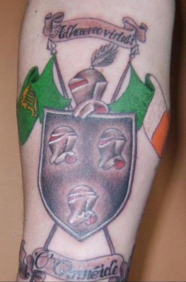 健壮男子左手大臂膀上超酷的盾形纹章纹身