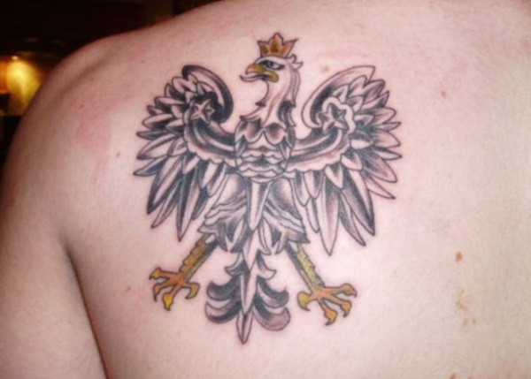 健壮男子左手大臂膀上超酷的盾形纹章纹身
