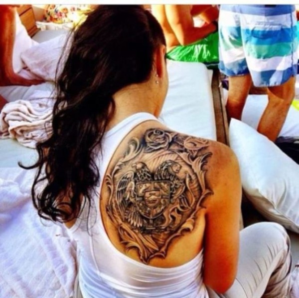 健壮男子左手大臂膀上超酷的盾形纹章纹身