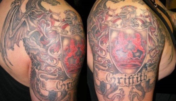 健壮男子左手大臂膀上超酷的盾形纹章纹身