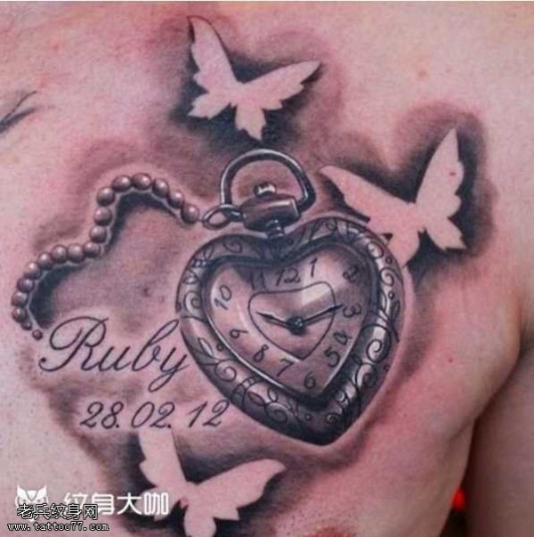 胸部闹钟英文纹身图案