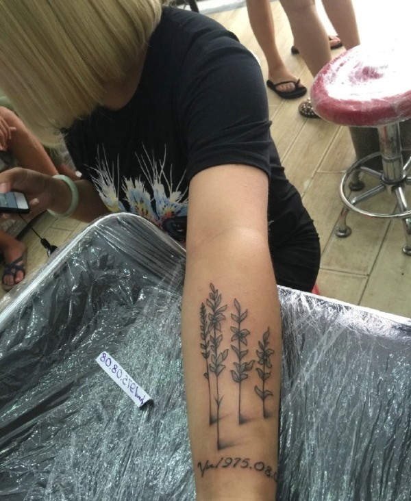 小树树与英文单词的手臂纹身图案