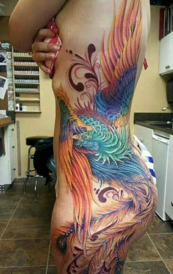 满背炫酷无比的彩色大凤凰纹身图案
