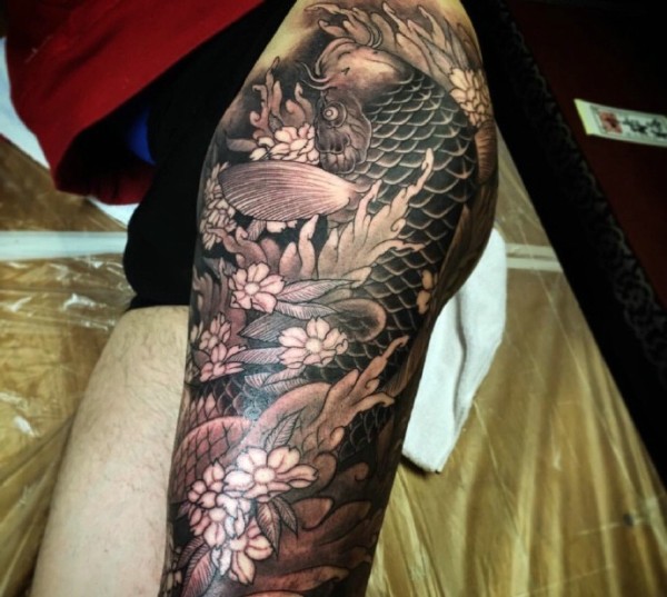传统鲤鱼花小腿纹身_腿部纹身图案大全_纹身图吧