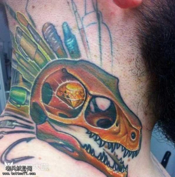 脖子上个性十足的彩色骷髅纹身_脖子纹身图案大全_纹身图吧