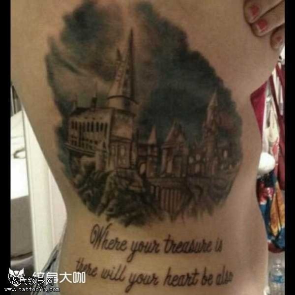 腰部古建筑纹身图案