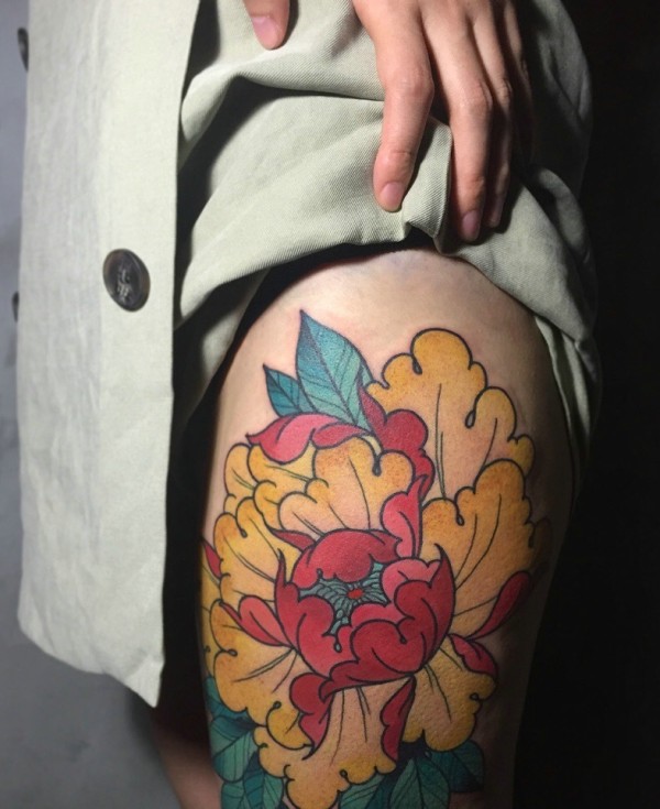 腿部外侧彩色牡丹花纹身图案