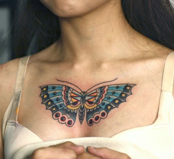 女生胸前彩色蝴蝶纹身图案很漂亮