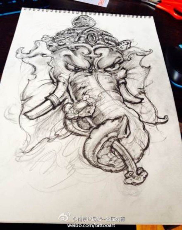 手臂黑灰象神_一组12张手臂上的黑灰象神纹身图案作品欣赏