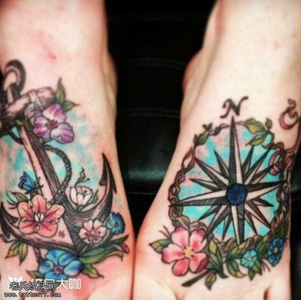脚部船锚指南针纹身图案