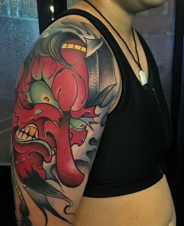 花臂抢眼的日式红般若纹身图案
