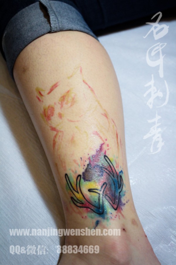 MM脚踝彩色猫头鹰纹身,炫彩水墨泼墨风格纹身