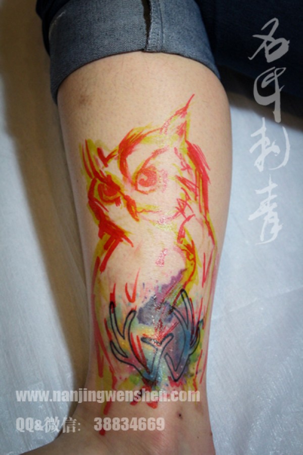 MM脚踝彩色猫头鹰纹身,炫彩水墨泼墨风格纹身