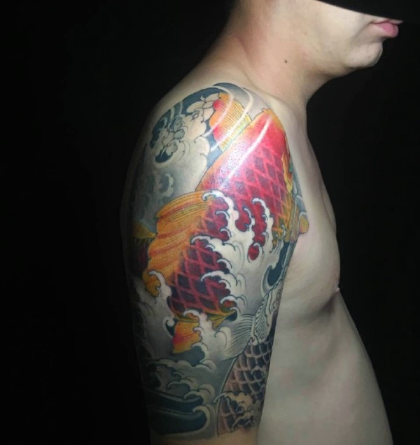 大臂青春具有活力的红鲤鱼纹身图案