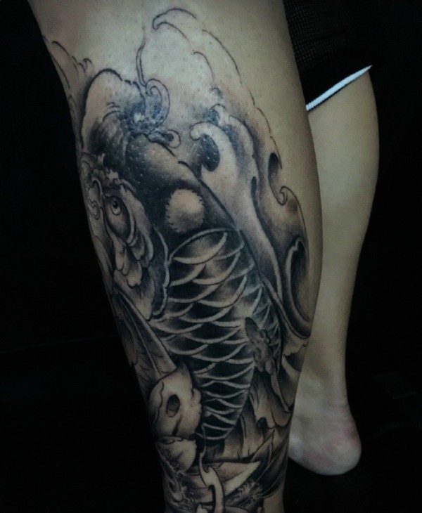 传统鲤鱼花小腿纹身_腿部纹身图案大全_纹身图吧